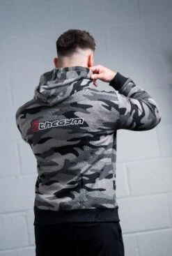 The @theGym Classic Hoodie shown here in Black/Grey-Camo-print design. Being 96% cotton and 4% spandex, it makes it an incredibly comfy and flexible top for lounging in and working out.