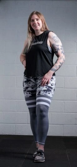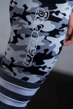 - Two-tone: Upper-leg is Grey-Camo, divided by white loops and all-black lightweight lower-leg