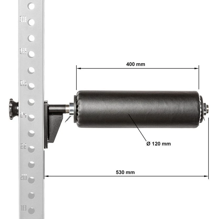 The rackable foam is a great accessory for the power rack and can be used for a variety of exercises. It consists of a solid steel pin/holder and a foam pad roll. The foam roll is 120mm wide and 400mm in length. The steel pin/holder has a plastic insert and washer to prevent damage to the rack. It is easy to attach to and remove from a rack due to the simple hand tightened nut that secures it to the rack. Can be used for a variety of exercises such as Bulgarian split squats and sit ups.