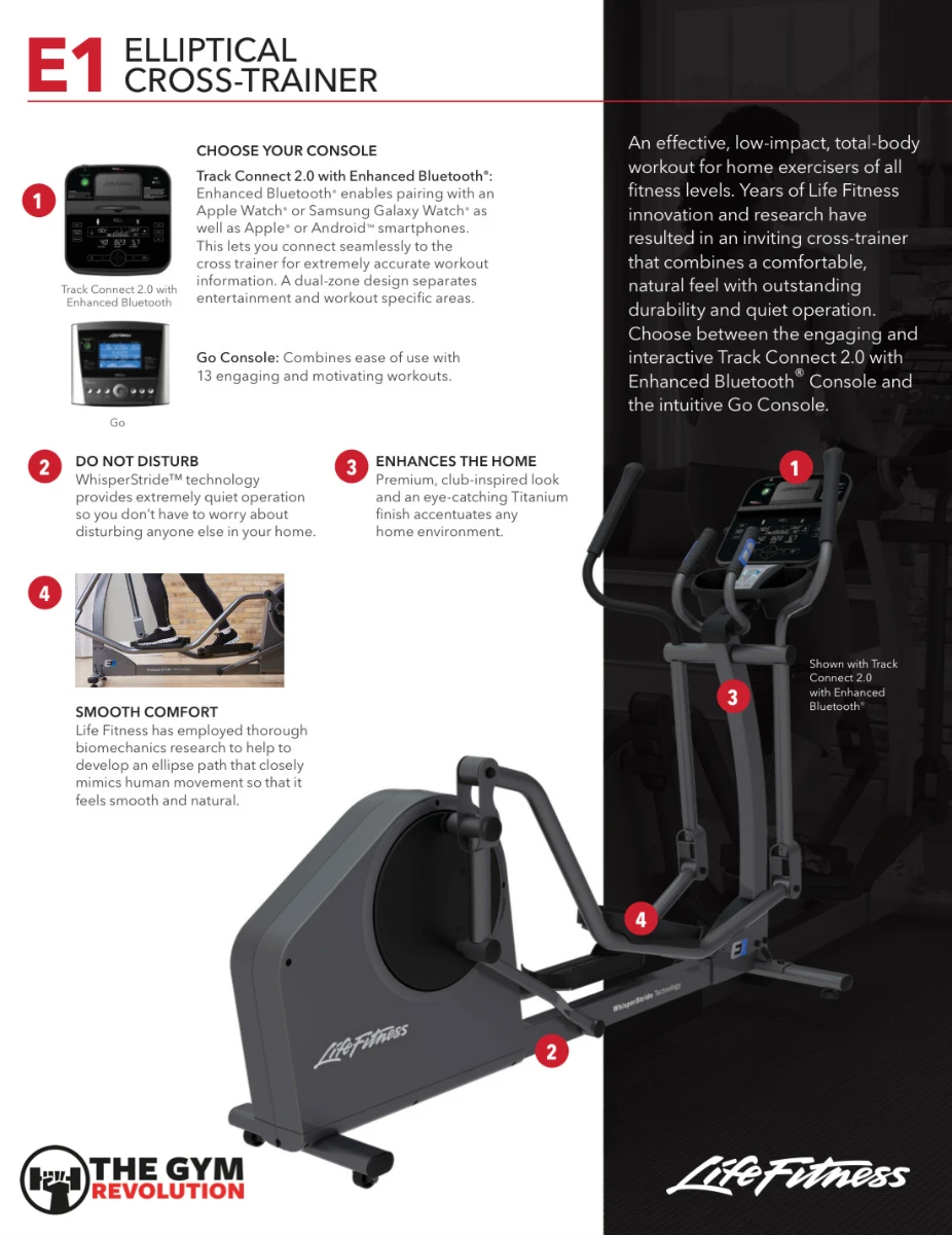 The E1 Elliptical Cross-Trainer offers a low-impact, total-body workout for home exercisers of all fitness levels. Years of Life Fitness innovation and research yielded an inviting elliptical cross-trainer that merges smooth and natural motions with outstanding durability and extremely quiet operation.