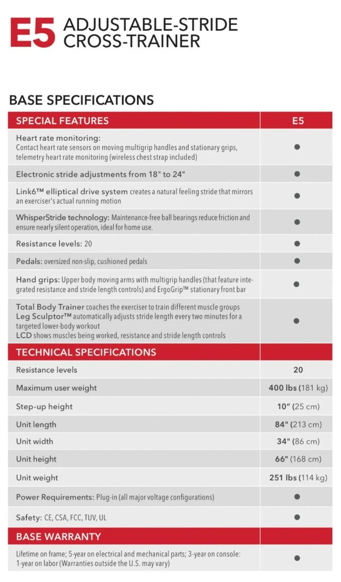The E5 Adjustable-Stride Elliptical Cross-Trainer is a versatile home exercise machine for effective total-body workouts. The stride adjusts from 18″ to 24″ with the push of a button and multigrip handles let exercisers work different muscle groups. The smooth and natural feeling ellipse path of the E5 Cross-Trainer is based on years of biomechanics research.