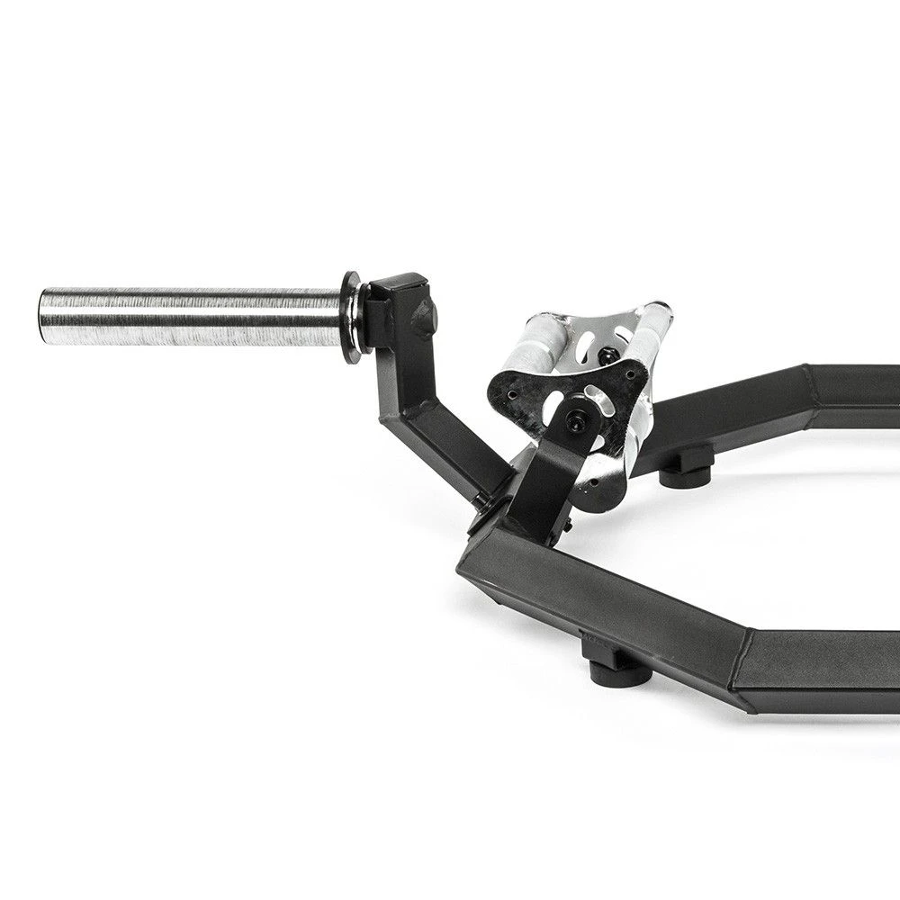 A rather unusual Trap/ Hex Bar, but one worth taking a second look at. Not only does the higher stance make it easier for loading and unloading, it also accomodates this rather unique multi-grip – 25mm, 38mm, 48mm – handle set-up. As trap bars are predominantly going to be used for grip-heavy work, such as deadlifts, shrugs, farmers walk, the handle thickness variation is a great feature and a bit of a leveller, if you have different abilities or size users working out together.