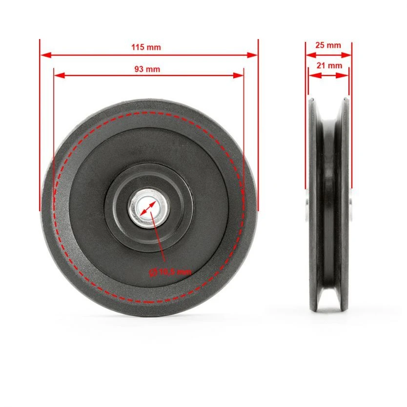 The 115mm pulley has a load capacity of 160kg. It has a closed ball bearing system and is made of shatter proof plastic. The centre hole is 10.5mm and the pulley can hold up to a 8mm cable. Fits all ATX equipment where applicable